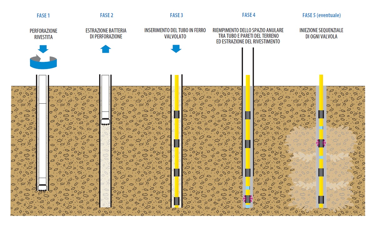 - Micropali ad alta pressione: posa di tubo metallico valvolato e iniezione di miscele cementizie per formazione guaina (iniezione primaria) e successiva iniezione di miscela cementizia attraverso il tubo valvulato (iniezione secondaria a pressione e sezione controllate).